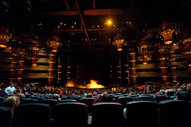 Imagine ancient warriors battling on a vertical cliff-side and swinging off of arrows -- that's the essence of Ka. Ka is a show with gravity-defying acrobatics on a massive moving stage that tilts from horizontal to vertical. You'll also see a giant bird (composed of humans) flying over the audience. The show is unique in Cirque's lineup for having a storyline, themed on two twins in a village that is one day attacked. Since the stage is so large, it's actually okay to sit further in the back to see everything.